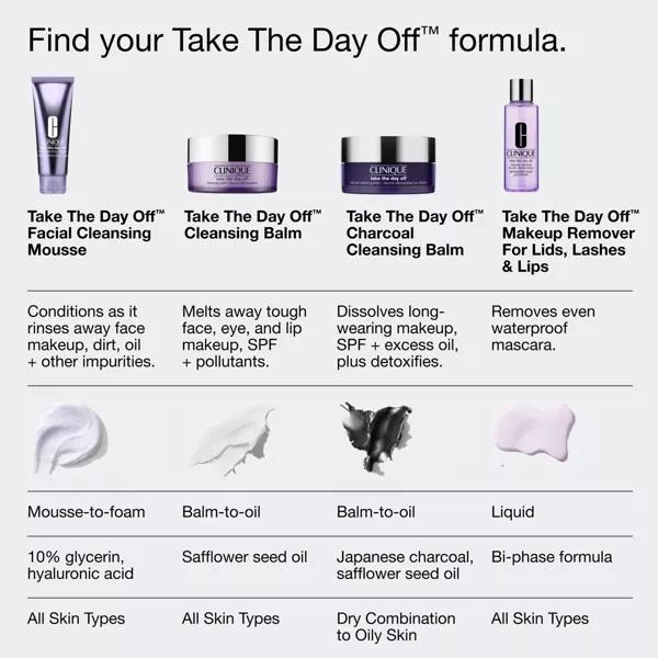 Clinique Take The Day Off™ Cleansing Balm is a lightweight makeup remover that quickly dissolves tenacious eye and face makeups, and sunscreens. Makeup remover transforms from a solid balm into a silky oil upon application. Cleans thoroughly, rinses off completely. Gently helps remove the stress of pollution so skin looks younger, longer.