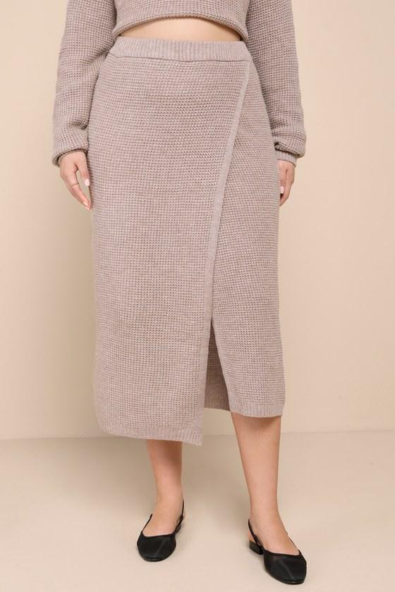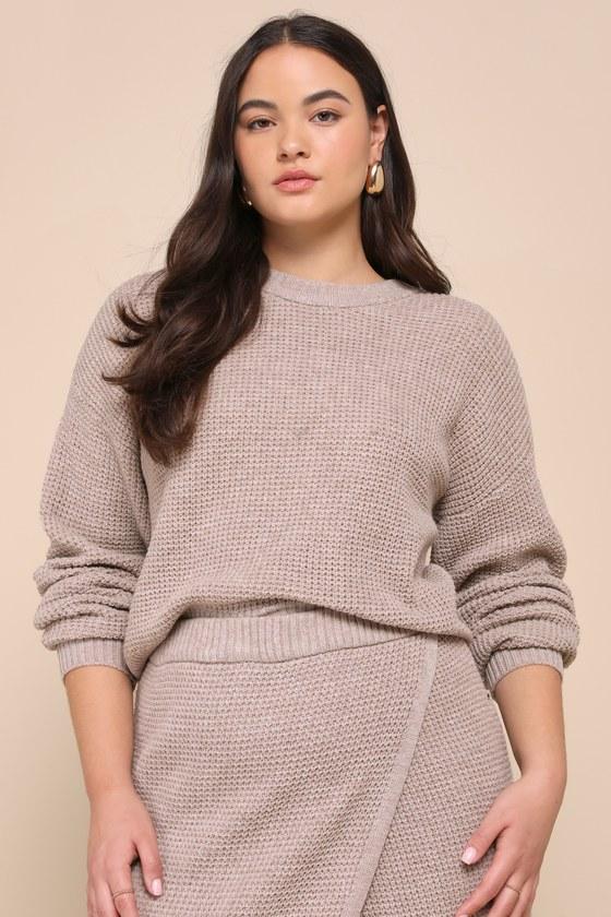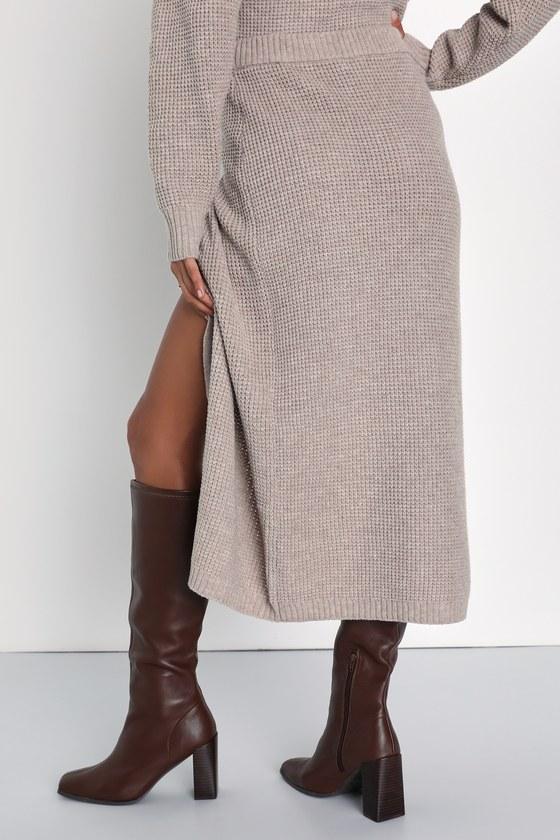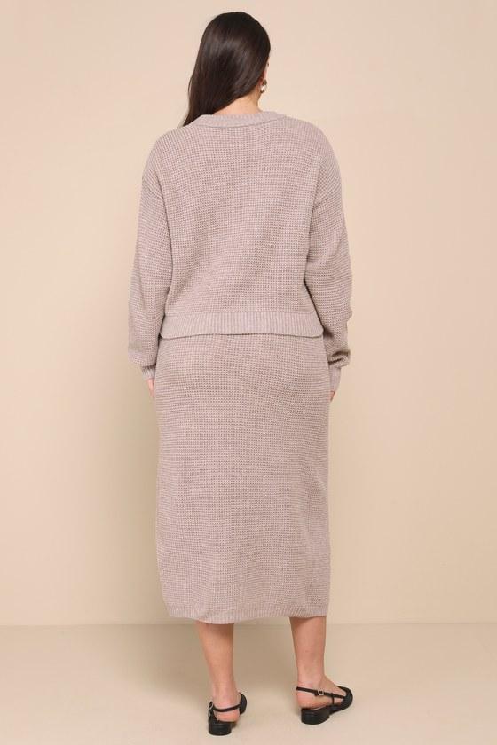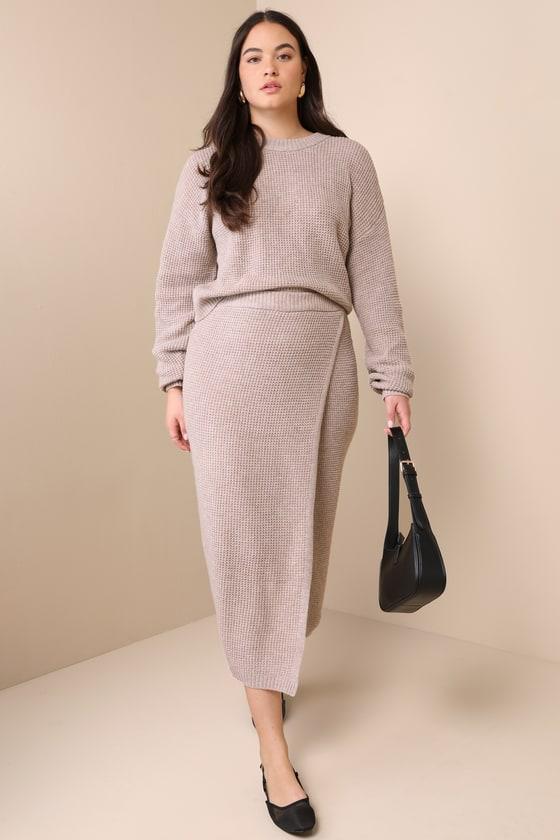 The Lulus Autumn Sweetheart Beige Waffle Knit Two-Piece Sweater Dress and a pair of cute boots is the essential fall 'fit and we're obsessed! Stretchy, warm waffle knit shapes this fall-worthy, two-piece dress that has a crew neck sweater with long sleeves and a boxy, slightly cropped bodice. The matching skirt has a high-waisted fit that falls to an overlapping, faux wrap silhouette that ends at a midi hem.