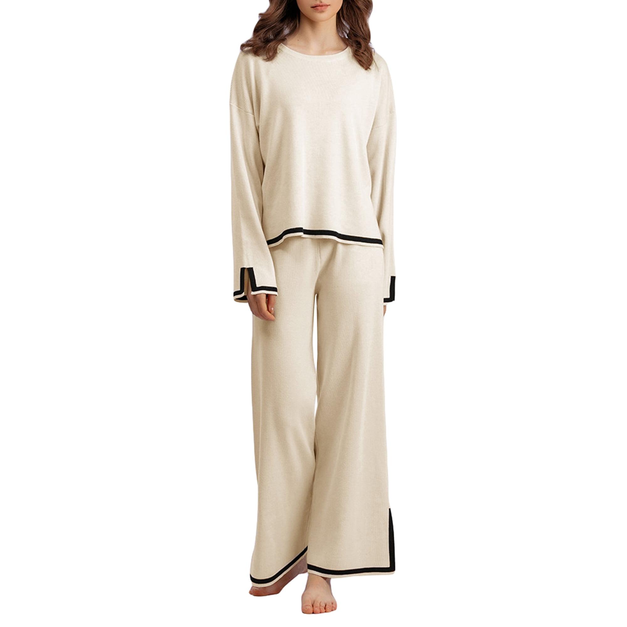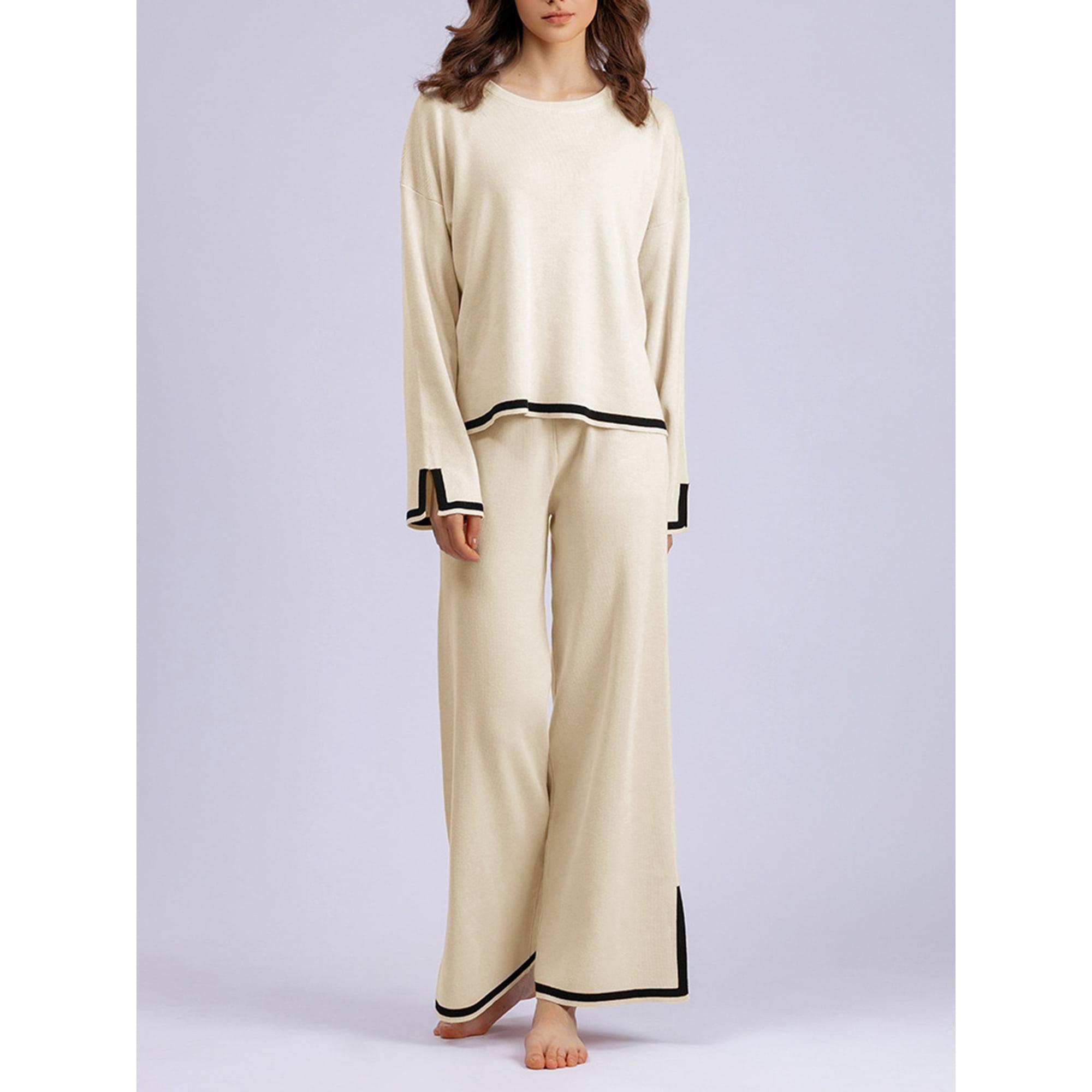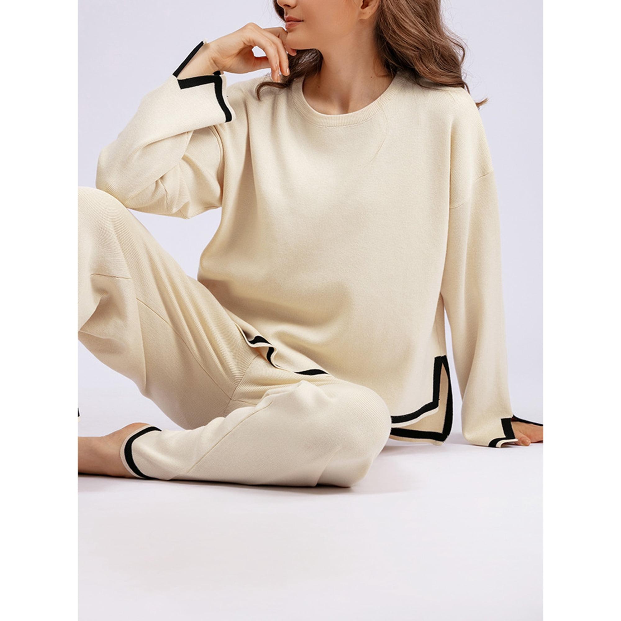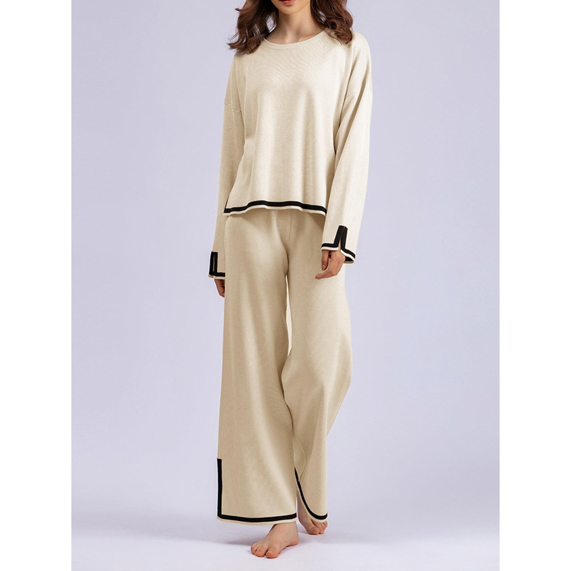 Gwiyeopda Knit Lounge Sets for Women 2 Piece Long Sleeve Contrast Color Pullover Sweater Top and Wide Leg Pants Set Streetwear