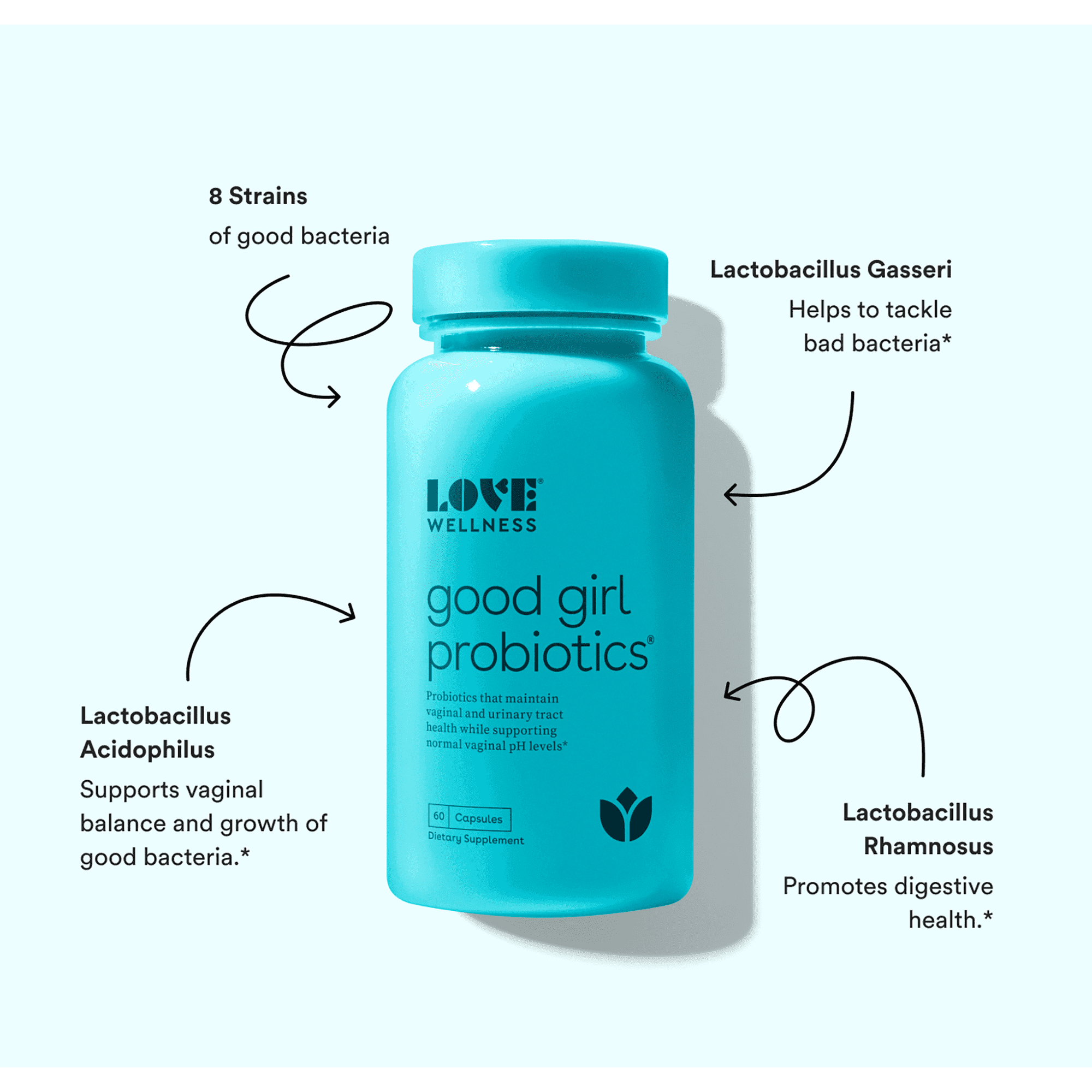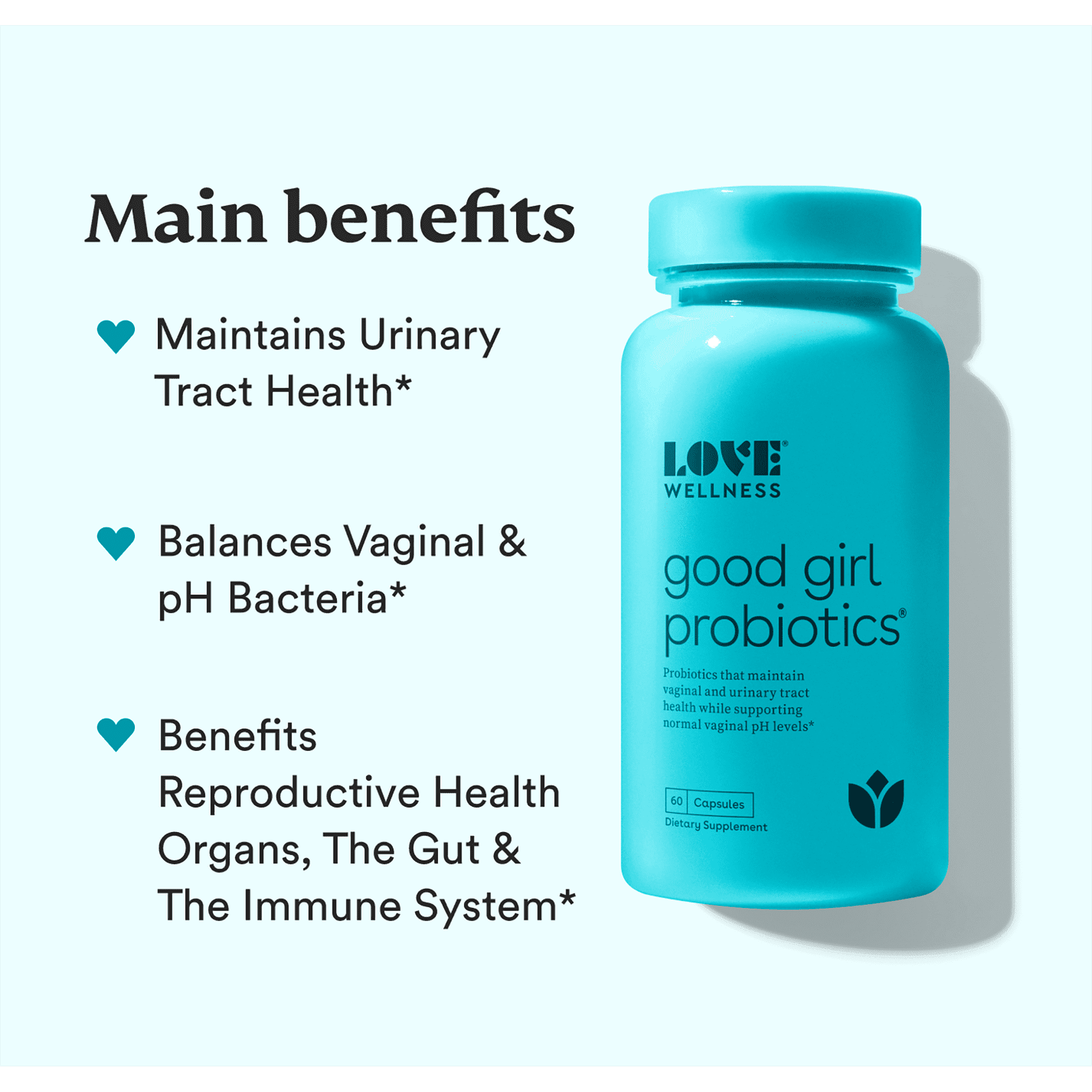 A Probiotic Designed for Vaginal Health: Good Girl Probiotics by Love Wellness helps to maintain vaginal and urinary tract health while supporting normal vaginal pH levels. Our formula contains 8 strains of probiotics — most only contain 1! How it Works: Good Girl Probiotics helps to maintain a balanced vaginal pH and healthy levels of vaginal yeast. This unique, gynecologist-recommended probiotic helps supports 3 key areas: reproductive health organs, the gut, and the immune system.