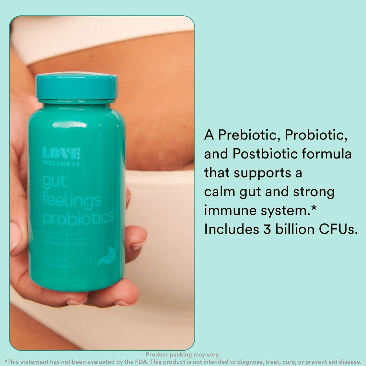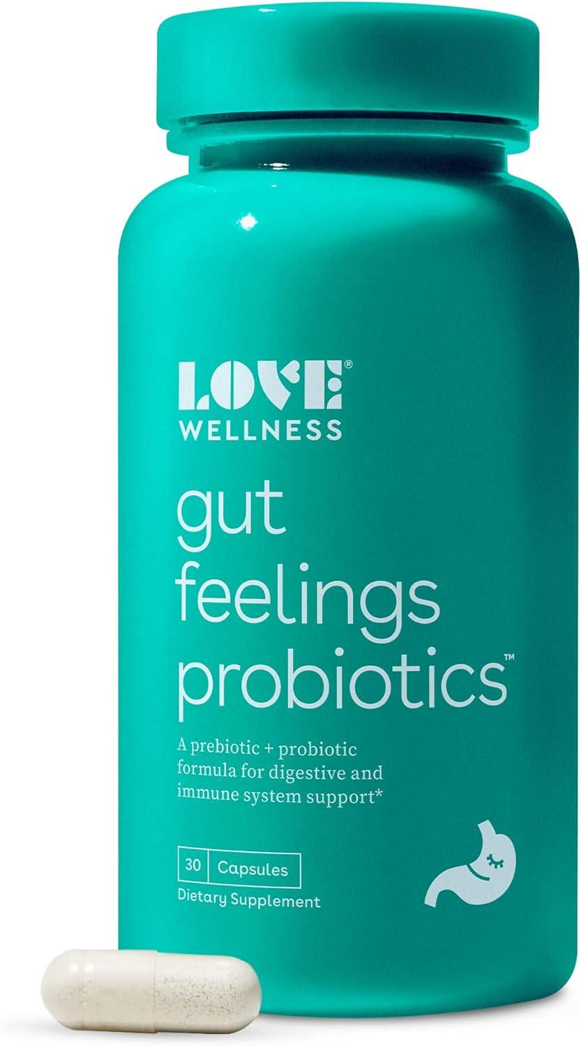 SUPPORT GUT HEALTH AND IMMUNITY: Love Wellness Gut Feelings Probiotic is an innovative trio of prebiotics, probiotics, and postbiotics created to support a calm gut and strong immune system.* 3 billion CFUs of probiotic strains work to support healthy gut function, digestive relief, and overall health.* Contains prebiotic fiber to keep things moving and help with occasional gas relief.* Serving size 1 capsule, 30 servings per bottle.Disclosure: We are a participant in the Amazon Services LLC Associates Program, an affiliate advertising program designed to provide a means for us to earn fees by linking to Amazon.com and Affiliate sites.