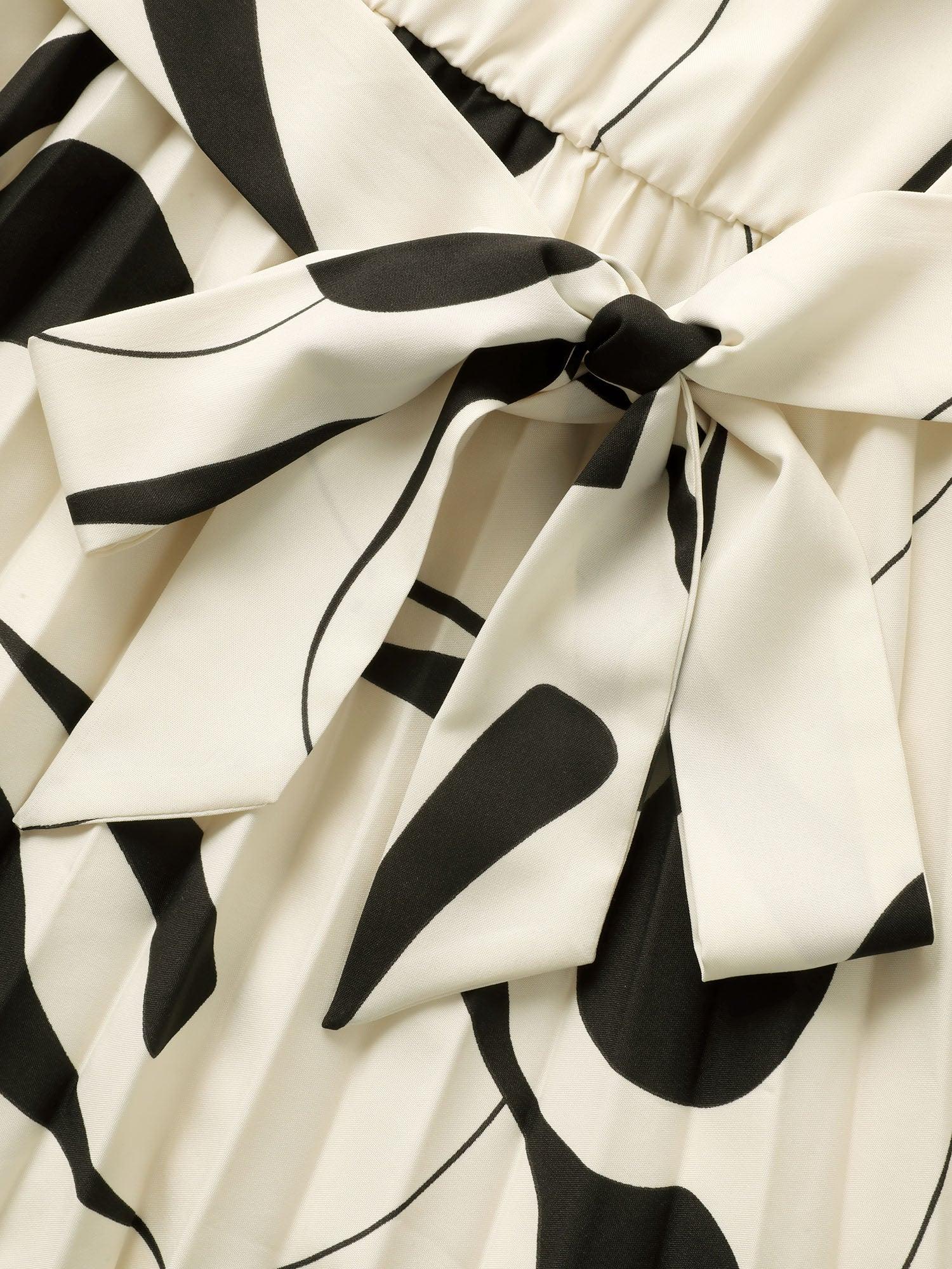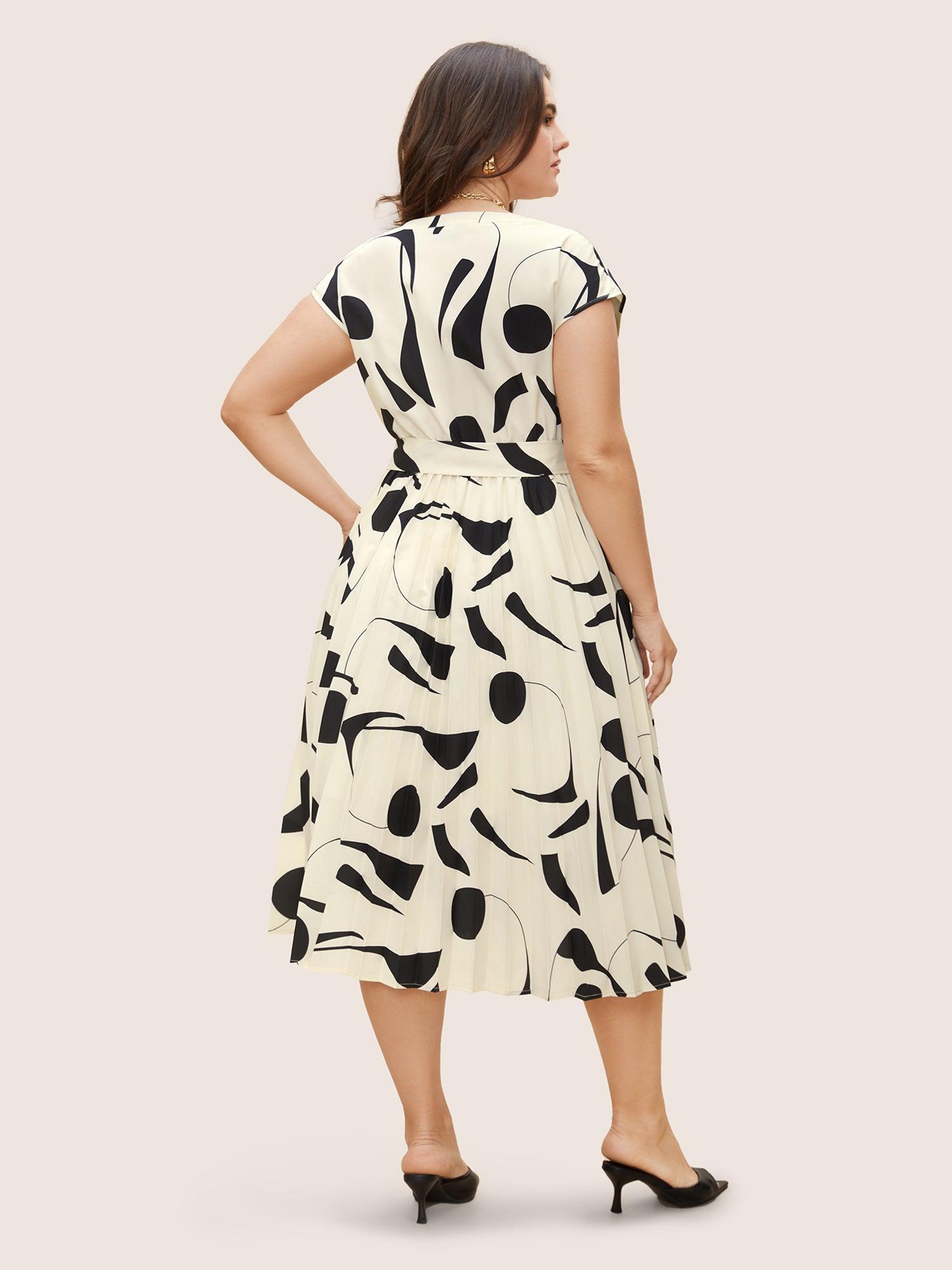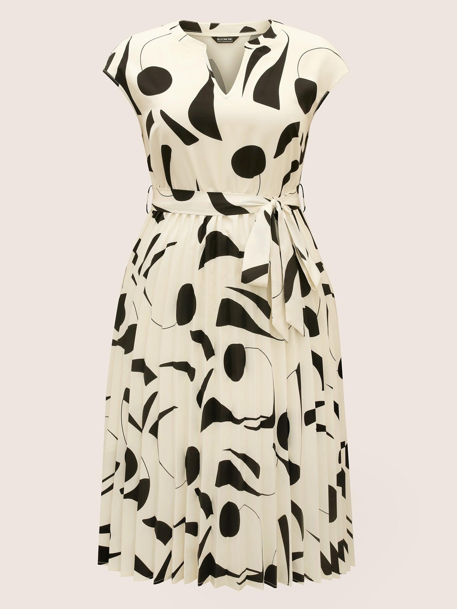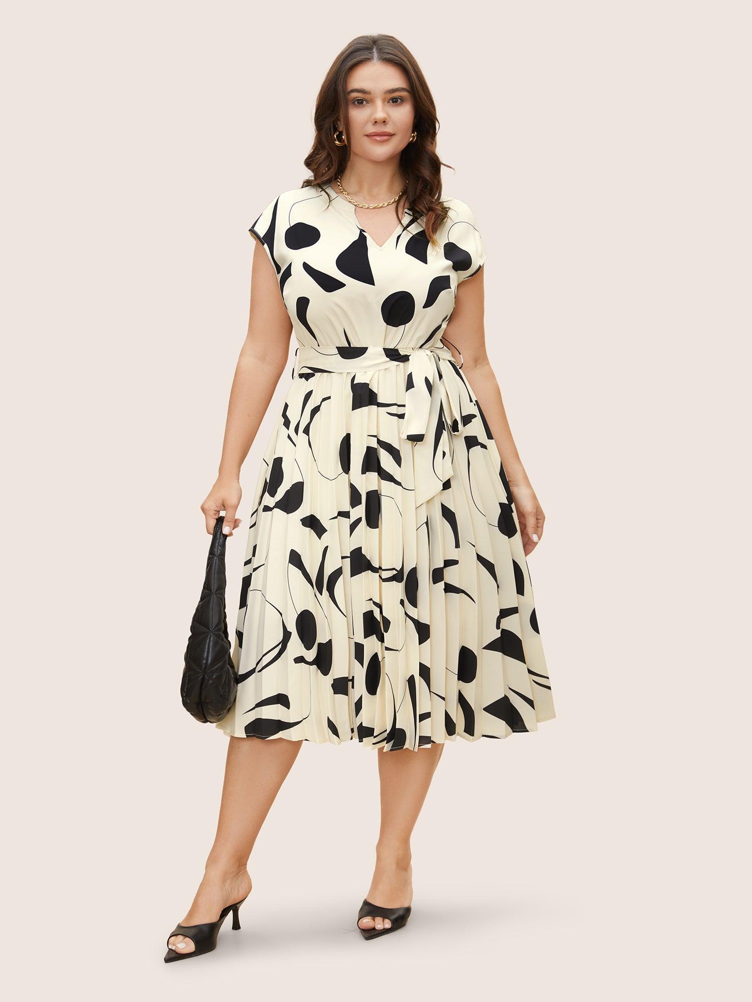 Fit & Sizing: Type: Regular. Stretch: No stretch. Sleeve Length: Cap Sleeve. Length Type: Midi. Other Info: Season: Fall. Color: Ivory. Style: At the Office. Neckline: Flat collar with V-notch. Sleeve Type: Dolman Sleeve. Prints: Geometric & color block. Details: Pleated, Belted. Pocket: Side seam pocket. Belt: Belt. Closure Type: Non.